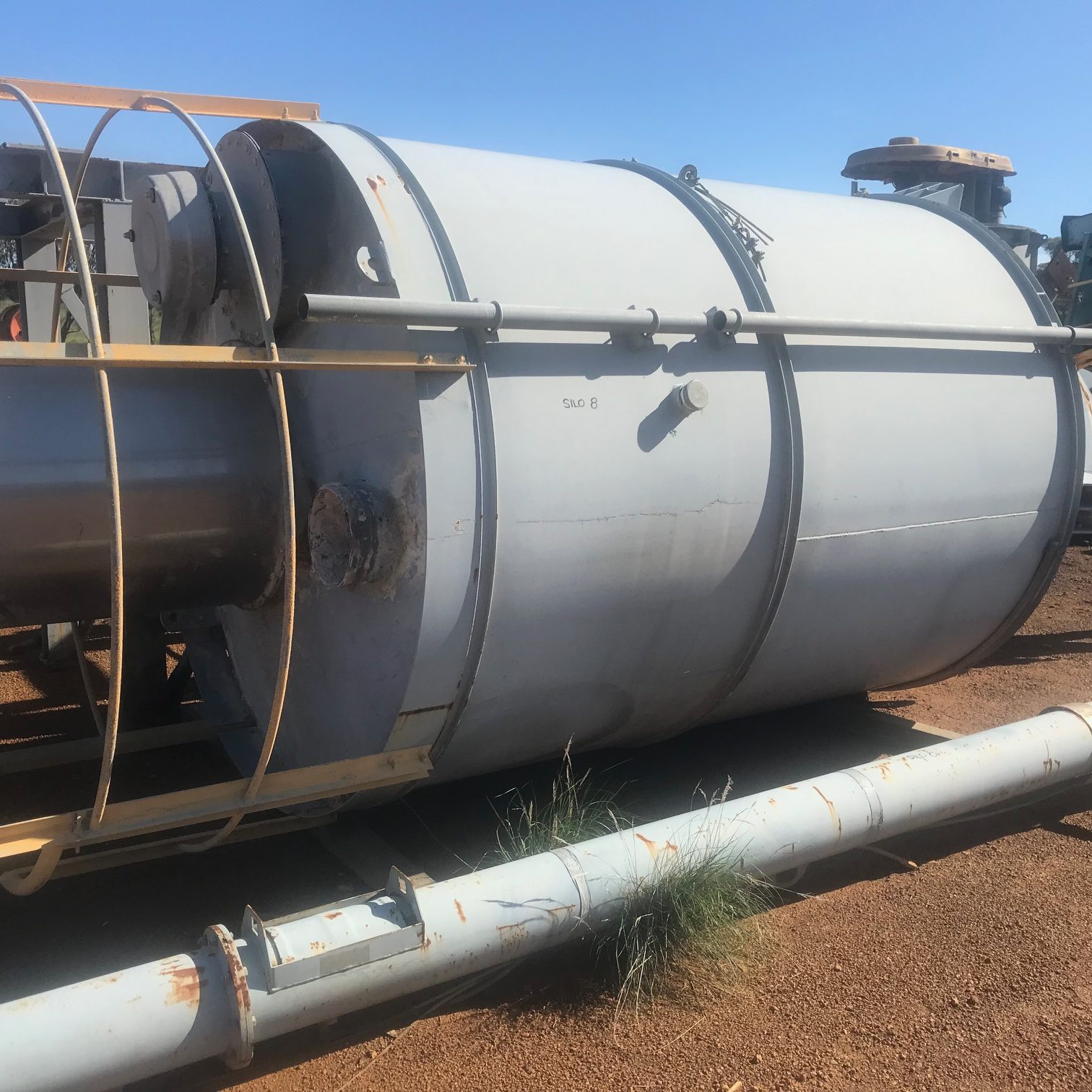 2.7 diameter x 17meter tall approximately 85 cubic meter silo fitted with fill pipe, reverse pulse dust extractor, ladder, internal twin screw discharge with rotary seal.